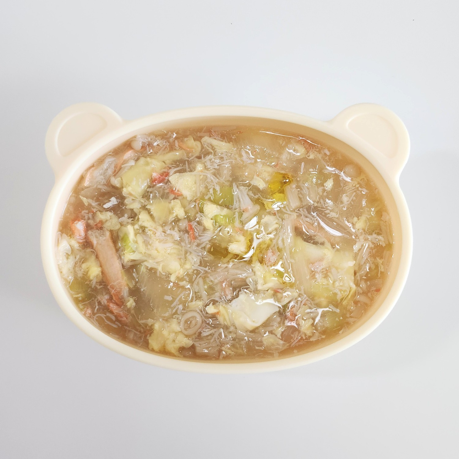 Hemos preparado una delicada sopa de cangrejo utilizando patas de centollo fresco compradas en Oasis Market. También es deliciosa si se prepara con palitos de cangrejo de imitación. Puedes ajustar la consistencia para servirla sobre arroz como un donburi o mezclarla con arroz para disfrutarla como sopa. Esta receta rinde para 1 bebé y 2 adultos.