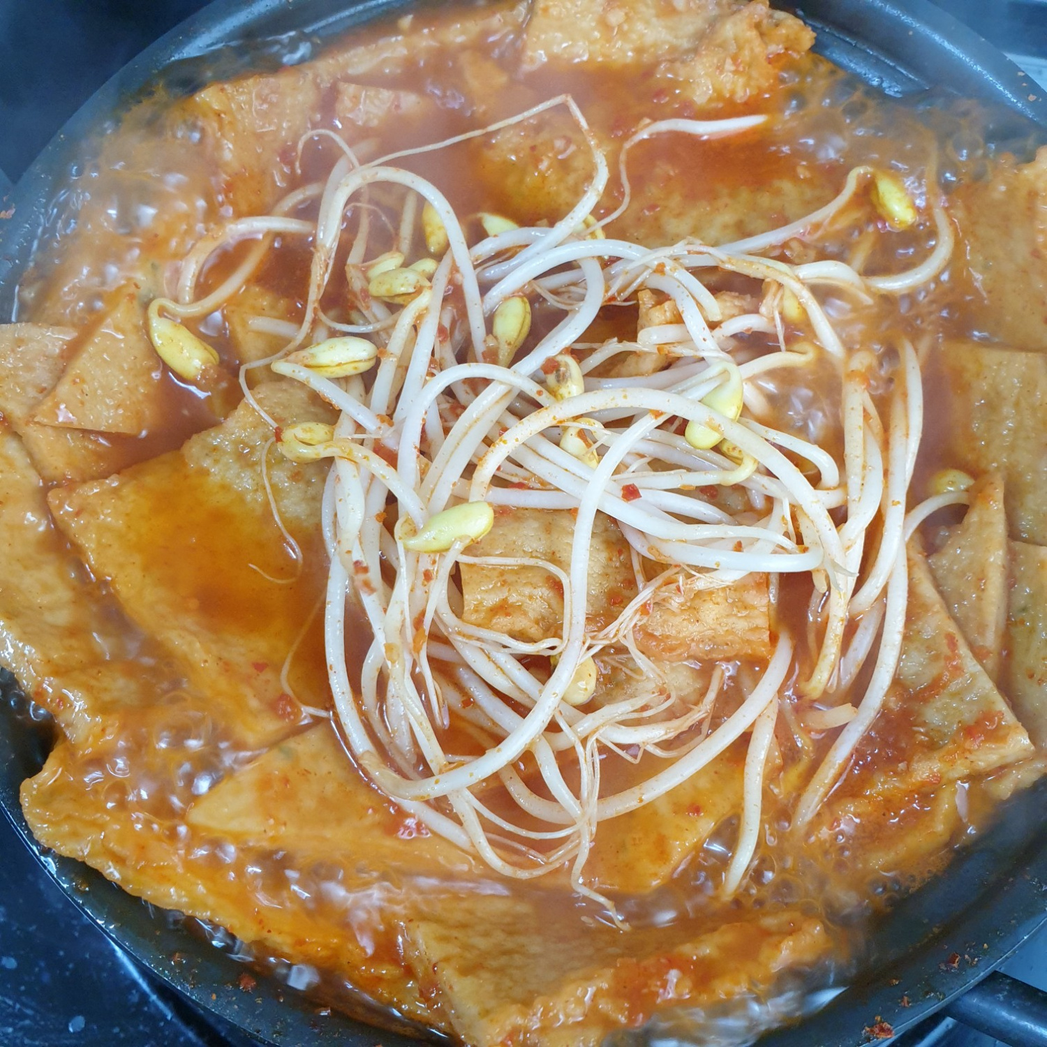 Cuando el eomuk esté parcialmente cocido y el caldo comience a reducirse ligeramente, añada los brotes de soja preparados. Es importante no cocinar demasiado los brotes de soja para mantener su textura crujiente. Cocine a fuego lento durante solo unos 2-3 minutos más, hasta que los brotes de soja comiencen a cocinarse.