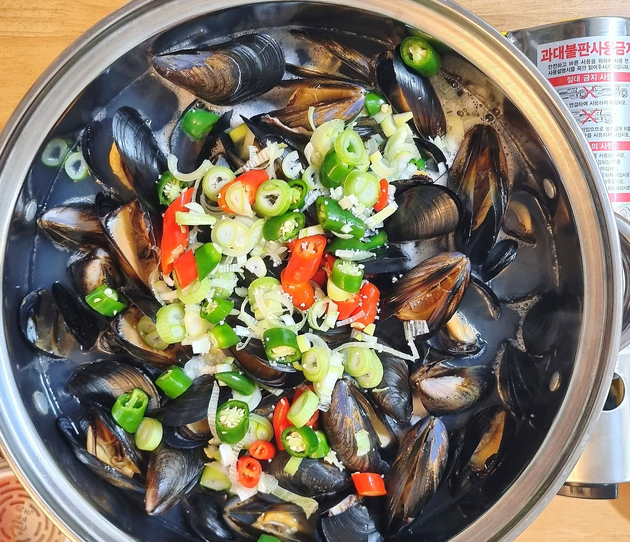Ahora, añade los chiles y las cebolletas picadas para realzar el sabor natural de los mejillones. Sazona con sal o salsa de soja coreana al final, ajustando a tu preferencia. Los mejillones proporcionan una maravillosa profundidad de sabor, y cocinar a fuego lento por más tiempo solo intensificará su delicioso sabor. Tapa la olla y cocina a fuego medio hasta que todos los mejillones se hayan abierto.