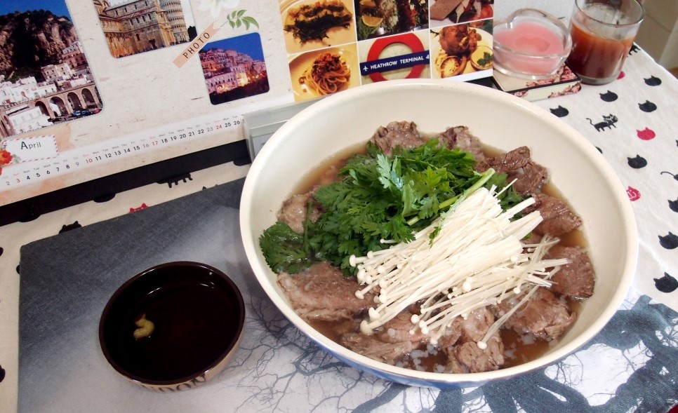 Coloca las piezas de pechuga de res cortadas en una olla ancha o cacerola, creando una presentación atractiva. Está perfectamente bien si la pechuga no está completamente cocida en esta etapa. Dado que se calentará nuevamente en el caldo, este nivel de cocción es ideal, evitando que la carne se vuelva dura al volver a cocinarse. Vierte el caldo claro sobre la pechuga, asegurándote de que llegue justo por debajo del nivel de la carne. Cualquier caldo sobrante se puede almacenar en el refrigerador durante 3-4 días y es increíblemente versátil. Se puede usar como base para una sustanciosa sopa de res (gomtang) o incorporarlo en otros platos con caldo. Al servir, llévalo a ebullición para obtener una deliciosa sopa de res. ¡Agrega rábano para una rica sopa de res y rábano, o dumplings para una satisfactoria sopa de dumplings!