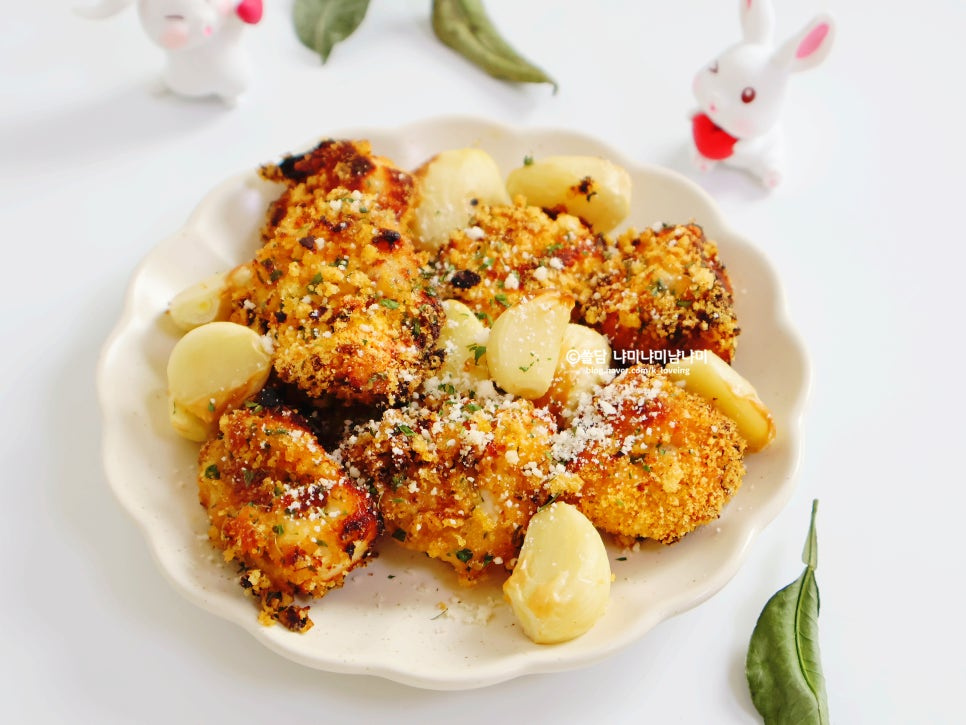 Precalienta tu freidora de aire a 180°C (350°F). Coloca las tiras de pollo rebozadas en una sola capa en la cesta de la freidora. Cocina durante 5-6 minutos. Dale la vuelta a las tiras de pollo, añade los dientes de ajo enteros a la cesta y cocina durante otros 5-6 minutos. El tiempo de cocción puede variar según el grosor del pollo y el modelo de tu freidora. Asegúrate de que el pollo esté bien cocido por dentro y que el rebozado esté dorado y crujiente.