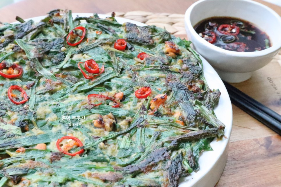 En un día lluvioso, ¡nada se compara con el chisporroteo y el aroma de un buchimgae recién hecho! Hoy, llevamos este clásico a otro nivel con hojas de perilla fragantes (también conocidas como ‘baechohyang’) y tierna carne de mejillón para una experiencia excepcionalmente sabrosa. Mi secreto es usar menos masa y dejar que los ingredientes frescos brillen. La frescura del cebollino, la deliciosa textura de los mejillones y el sutil aroma de las hojas de perilla crean una sinfonía de sabores que traerá felicidad con cada bocado. ¡Prepárate para disfrutar de un buchimgae crujiente por fuera y maravillosamente jugoso por dentro, un sabor que encantará a todos! ¡Bienvenido al delicioso mundo del buchimgae!