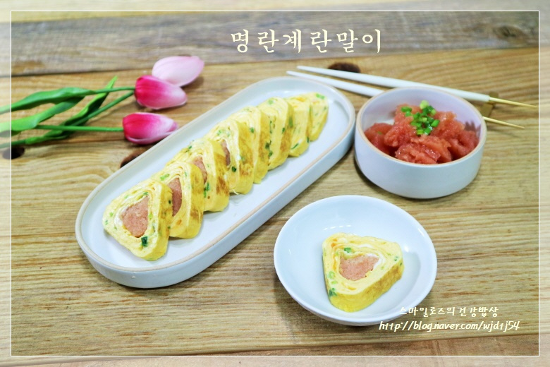 Coloca la tortilla enrollada de myeongran, bellamente cortada, en un plato para servir. ¡Tu delicioso plato está ahora completo!