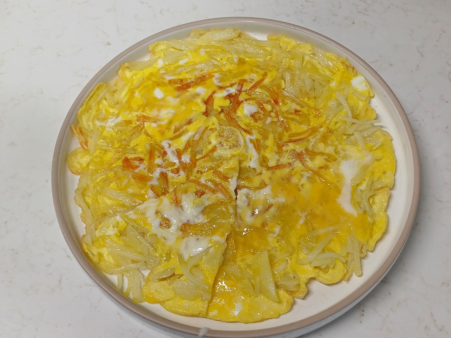 Cuando la parte inferior de la tortita de papa esté dorada y crujiente, dale la vuelta con cuidado. Inmediatamente después de darle la vuelta, vierte la mezcla de huevo preparada uniformemente sobre la tortita de papa.