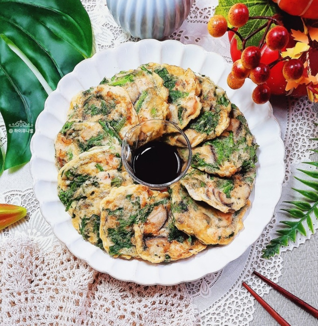 Compré un manojo de hojas de crisantemo frescas en el supermercado. Sinceramente, ¡era la primera vez que compraba y cocinaba con ellas! Quizás por mi poca experiencia en la cocina, solo conocía las hojas de crisantemo como un adorno para las tortitas. Nunca pensé en comprarlas específicamente, asumiendo que no eran esenciales. Sin embargo, al ver las publicaciones de otros blogueros, ¡descubrí que mucha gente prepara deliciosas tortitas usando las hojas de crisantemo como ingrediente principal! Vi recetas que incluían camarones picados o hongos shiitake añadidos. Decidí probar a prepararla con ambos. Descongelé unos camarones del congelador y añadí hongos shiitake que tenía en la nevera para crear esta ‘Tortita de Crisantemo con Camarones y Shiitake’. ¡Resultó ser un plato maravillosamente sabroso y aromático donde las hojas de crisantemo realmente brillan!