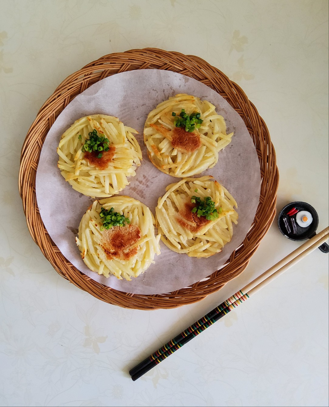 ¡Y ahí lo tiene! Sus deliciosas Tortitas de Patata y Huevas de Abadejo están listas. Disfrute de la combinación perfecta de exterior crujiente e interior tierno, repleto del sabor umami de las huevas de abadejo.