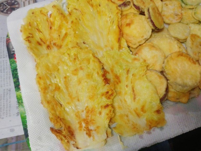 Caliente una sartén a fuego medio y agregue una cantidad generosa de aceite de cocina. Sumerja cada hoja de col preparada en la masa, asegurándose de que esté bien cubierta, y colóquela en la sartén caliente. Cocine hasta que esté dorada por un lado.
