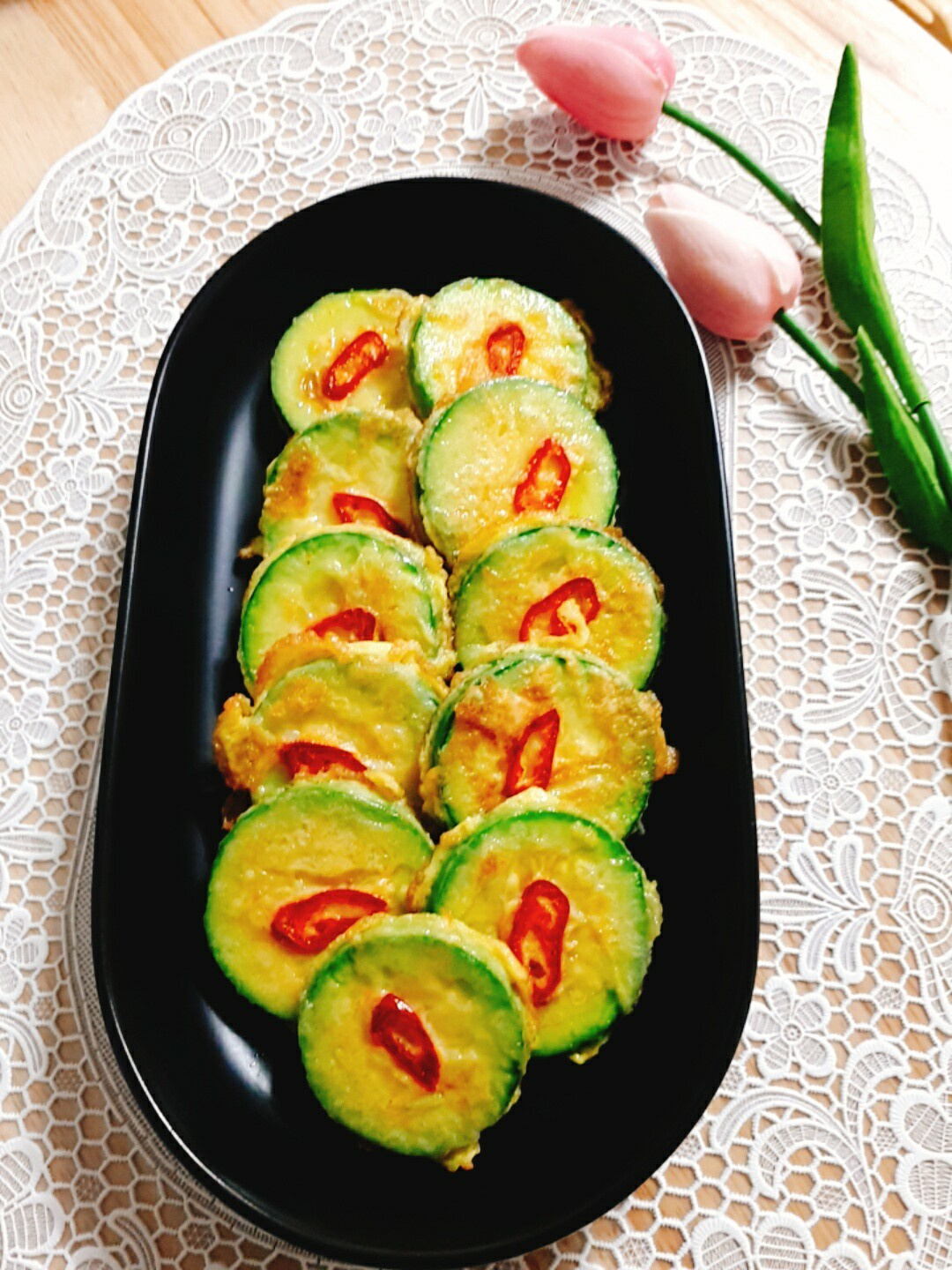 Caliente unas 4-5 cucharadas de aceite de girasol en una sartén a fuego medio-bajo. Pase cada rodaja de calabacín enharinada por la mezcla de huevo batido, asegurándose de que quede bien cubierta, y colóquela en la sartén caliente. Coloque una rodaja de chile rojo encima de cada rodaja de calabacín. Fría hasta que estén doradas por ambos lados, volteando con cuidado. Es importante mantener un fuego medio-bajo para evitar que se quemen.