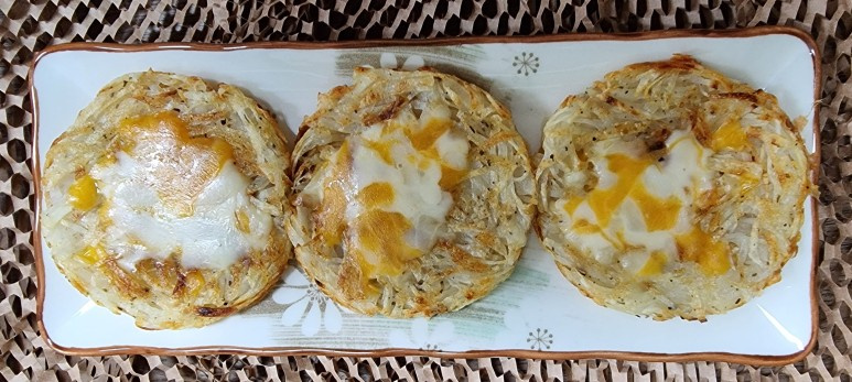 Una tortita de papa rallada maravillosamente crujiente y esponjosa está lista, realzada por el cremoso queso. El sabor limpio y suave natural de las papas armoniza perfectamente con la riqueza suave y aromática del queso. Son tan adictivas que no podrás parar de comerlas. ¡Las papas y el queso también son una excelente combinación nutricional! Las papas son alimentos alcalinos ricos en Vitamina C, mientras que el queso es un alimento ácido rico en Vitamina A y sal. La Vitamina A y la sal del queso ayudan en la absorción de la Vitamina C de las papas, y el potasio de las papas ayuda a regular la sal absorbida del queso. ¡Combinarlos asegura tanto un gran sabor como beneficios para la salud. ¡Asegúrate de prepararlos juntos!