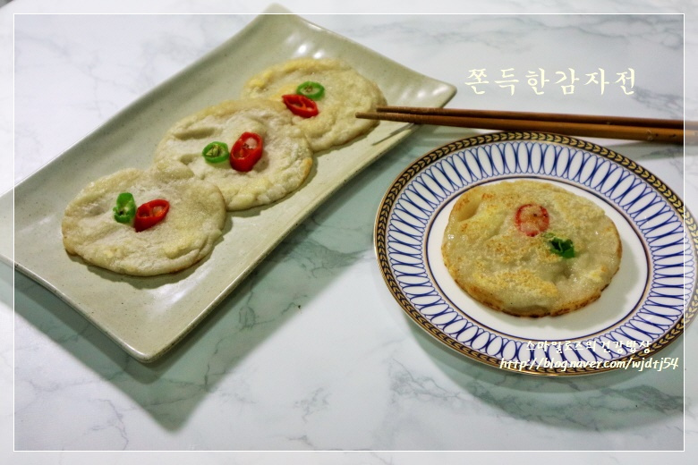 Vierte la masa de patata en la sartén caliente usando un cucharón, formando tortitas redondas. Para un toque visualmente atractivo, pica finamente los chiles rojos y verdes y colócalos artísticamente sobre la masa. Si tienes hojas de shiso (sukgat), también añadirían un aroma y apariencia encantadores.