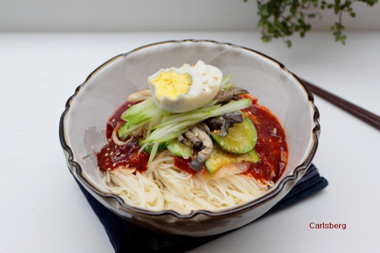 Hierva los fideos somen en abundante agua hirviendo hasta que estén al dente. Es importante soltar los fideos suavemente con palillos mientras se cuecen para evitar que se peguen. Una vez cocidos, enjuague los fideos a fondo con agua fría corriente para eliminar el exceso de almidón. Escúrralos bien en un colador. Coloque los fideos escurridos en un bol y cúbralos generosamente con aproximadamente 2 cucharadas de la salsa Bibim preparada. Ajuste la cantidad de salsa según su preferencia personal.