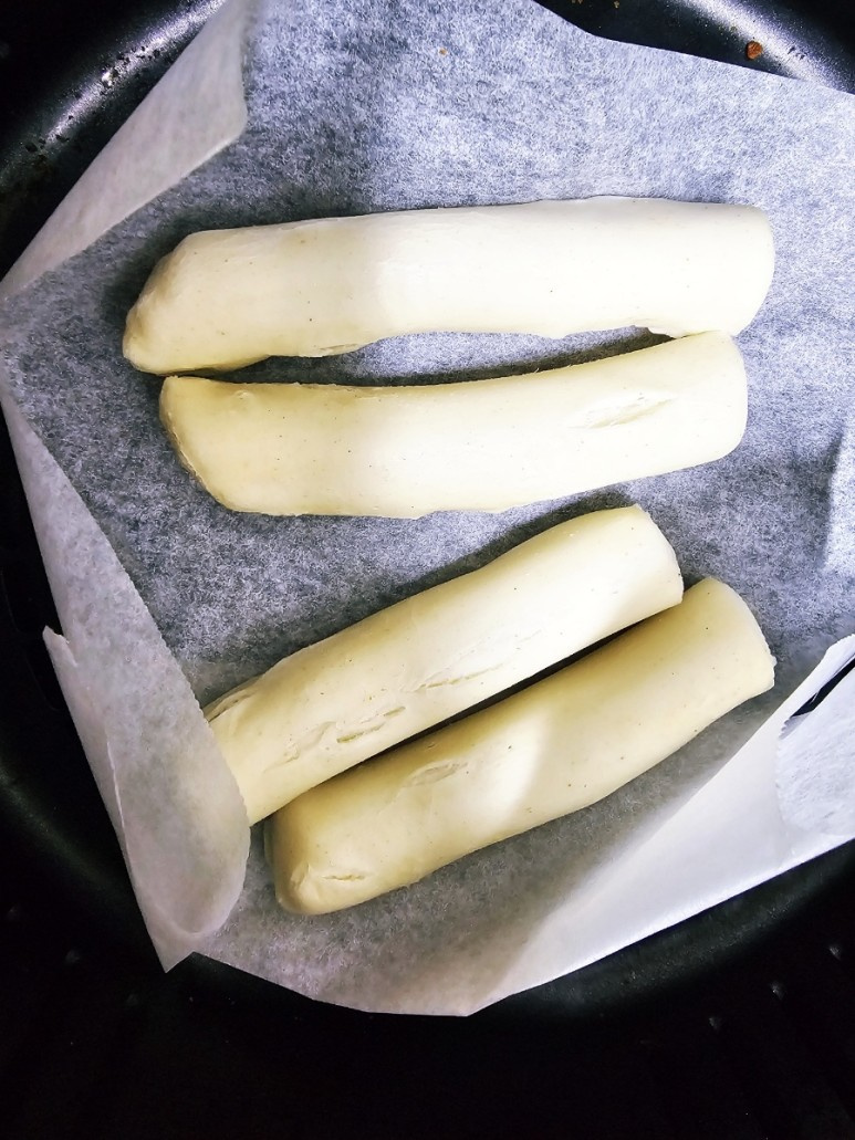 Forra la cesta de tu air fryer con papel de horno. Coloca los 4 trozos de gara-tteok congelado en una sola capa, asegurándote de que no se superpongan. Esto ayuda a que se cocinen de manera uniforme.