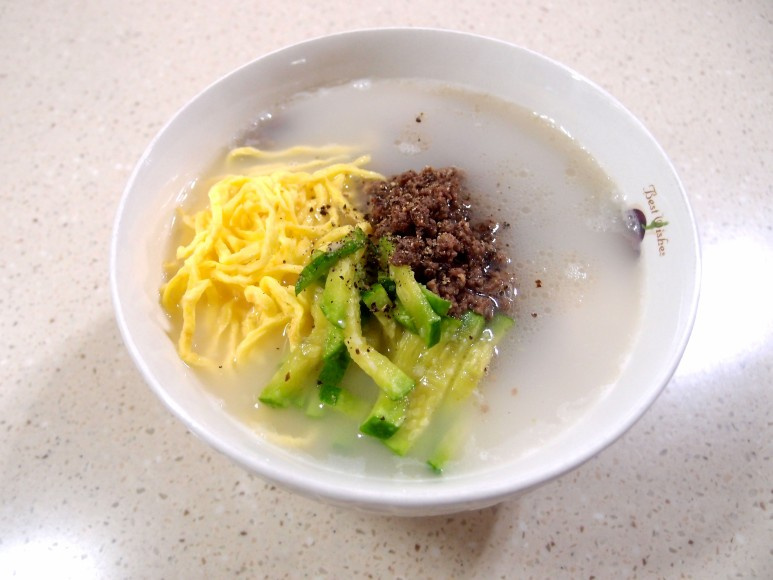 Tradicionalmente, el tteokguk de Seollal (Año Nuevo Lunar) se preparaba con un caldo claro hervido de pecho y morcillo de res, no de caldo de huesos. El aderezo de carne tampoco se salteaba; en su lugar, el pecho y morcillo hervidos se desmenuzaban y se mezclaban con ajo picado, aceite de sésamo y cebolletas picadas. Si bien el aderezo de huevo era común en ese entonces, parece ser menos frecuente hoy en día. Preparar el caldo claro implica la tediosa tarea de retirar la grasa. Esta receta ofrece un atajo: usar polvo de caldo de huesos de res para el caldo y un aderezo de carne picada salteada sazonada con salsa de soja. Añadir calabacín salteado y aderezo de huevo proporciona un hermoso color y completa este festivo tteokguk.