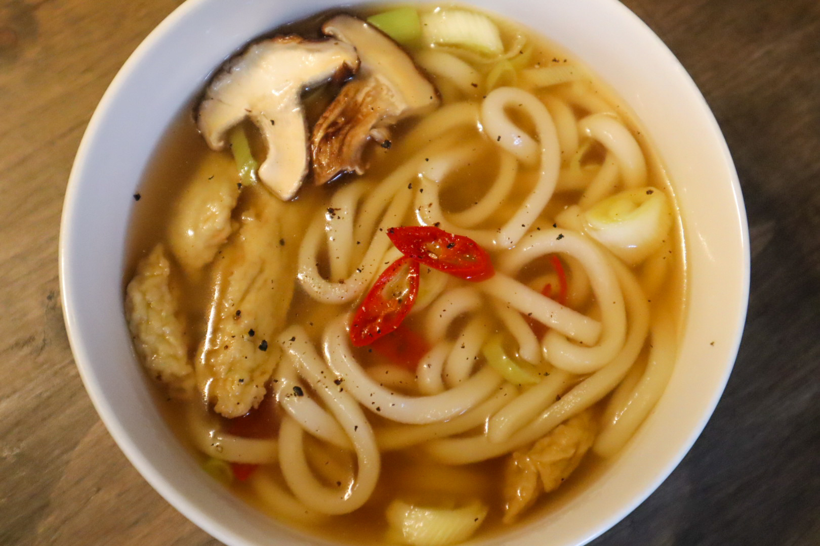 Después de agregar los fideos, incorpore los champiñones shiitake y los pasteles de pescado preparados, cortados en trozos del tamaño de un bocado. Los champiñones shiitake añadirán un sabor umami profundo, mientras que los pasteles de pescado ofrecerán una deliciosa textura masticable y riqueza. Finalmente, espolvoree una pizca de pimienta negra para un toque aromático.