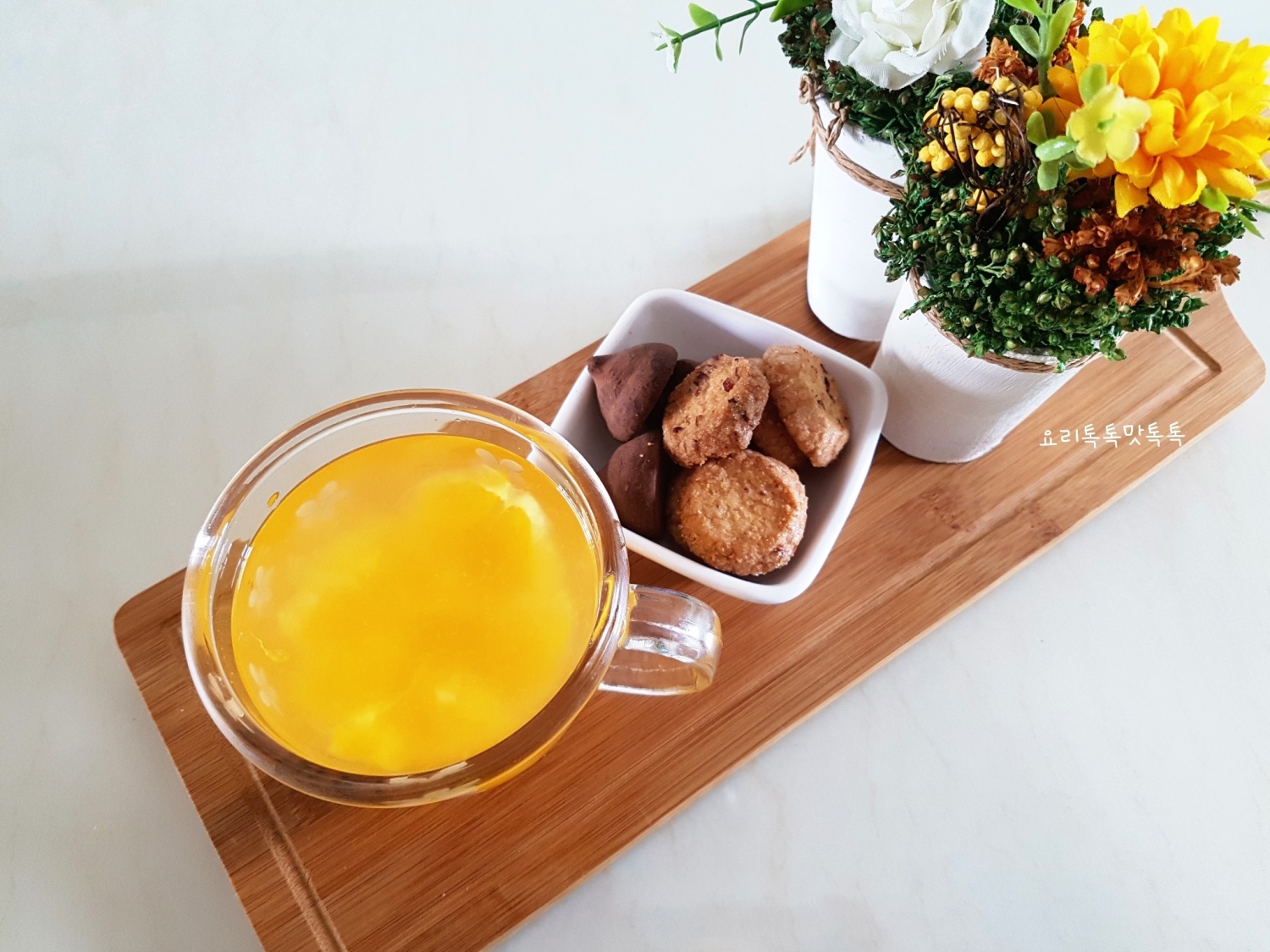 A mi familia no le gusta mucho la fruta, así que incluso las pequeñas compras a menudo terminan echándose a perder. Por eso rara vez compro fruta. Sin embargo, vi estas mandarinas grandes y no demasiado ácidas y compré una bolsa. Mis hijos comieron unas cinco y luego perdieron el interés. Preocupado por que se estropearan, ¡decidí hacer confitura de mandarina! Las conservas de fruta son increíblemente fáciles de hacer: solo necesitas fruta y azúcar. Esta vez, para una opción más saludable, usé azúcar xylos y alulosa. Consideré pelar completamente las mandarinas para usar solo la pulpa, pero terminé quitando la parte blanca y picándolas finamente. ¡Quitar la parte blanca sola me dio calambres en los dedos! 😂 Después de unos 3 días de refrigeración, el azúcar se disolvió y ya la estábamos disfrutando como té. Mis hijos, después de probarla, exclamaron: ‘¡Qué es esto? ¡Está deliciosa!’ y se comieron hasta la última gota, incluida la pulpa. También sería maravillosa servida con bocadillos sencillos. El delicioso aroma a mandarina llena el aire, y este té de mandarina rico en vitamina C se puede disfrutar caliente. ¿Qué tal probarlo como una forma de prevenir resfriados este invierno? 😊