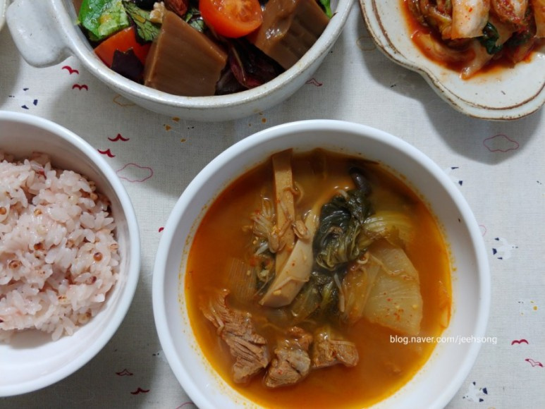 Mientras se cocina la carne, pon a hervir otra olla con abundante agua salada. Escalda brevemente la col napa joven, los brotes de soja y las cebolletas por separado. Después de escaldarlas, no enjuagues las verduras con agua fría; en su lugar, retíralas inmediatamente y exprime suavemente el exceso de agua. (Esto ayuda a mantener la textura crujiente de las verduras).