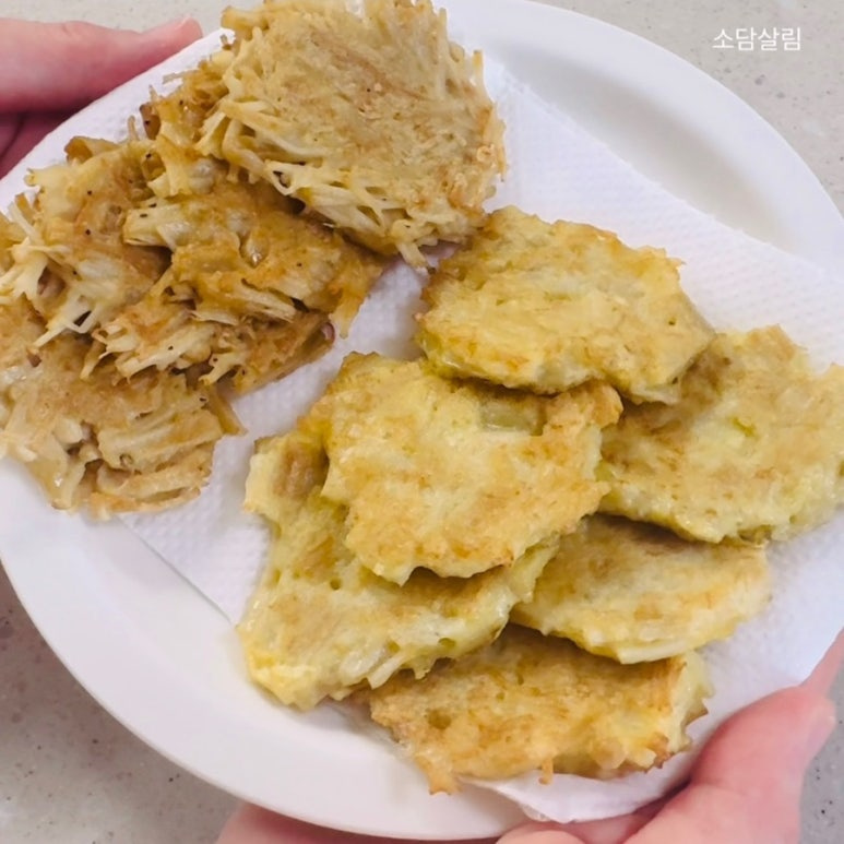 Anak pertama saya berusia 35 bulan, dan yang bungsu berusia 12 bulan. Mengingat perbedaan usia dan fakta bahwa si bungsu baru saja mulai makanan padat, saya menyiapkan hidangan yang berbeda untuk mereka agar sesuai dengan kebutuhan mereka, menghindari rasa yang kuat atau tekstur yang keras. Hari ini, saya berbagi dua resep jamur enoki: satu adalah ‘Ayam Enoki’ yang sedikit dibumbui (terinspirasi dari resep ‘Pyeonstorang’ oleh Han Ji-hye), dan untuk anak saya yang lebih kecil, saya membuat puding jamur enoki sederhana yang dimasak dengan telur. Puding ini sempurna untuk balita yang pemilih maupun yang berpetualang!