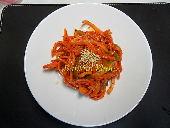 Sekarang, mari siapkan bumbu yang lezat. Dalam mangkuk kecil, campurkan semua bahan bumbu: gochujang, gochugaru, lada hitam, bawang putih cincang, maesilcheong, gula, cuka, minyak wijen, biji wijen panggang, dan daun bawang cincang. Campurkan hingga rata dengan sendok. Jika Anda tidak memiliki maesilcheong, Anda bisa menambahkan jumlah cuka untuk mendapatkan rasa asam yang diinginkan. Maesilcheong menambahkan rasa manis dan asam alami yang dalam yang meningkatkan cita rasa hidangan. (Tips: Saya pribadi menggunakan maesilcheong buatan sendiri yang dibuat selama musim plum setiap tahun.) Anda bisa mencampur acar segera, tetapi membiarkan bumbu beristirahat selama sekitar 30 menit di lemari es akan membuat rasa lebih meresap dan mendalam.