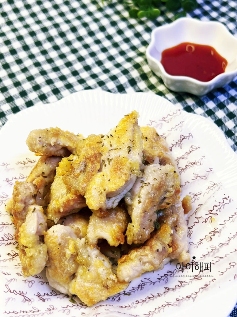 Saya menggunakan ‘Chorokmaru Herb Salt’. Jika tidak ada, Anda tetap bisa membuat ayam goreng yang lezat dan sederhana hanya dengan garam, merica, dan bawang putih cincang. Garam herbal memberikan aroma rempah yang halus, meningkatkan rasa tanpa menutupi rasa asli ayam. Jika punya waktu, marinasi ayam selama sekitar 30 menit akan lebih memperkaya rasa.