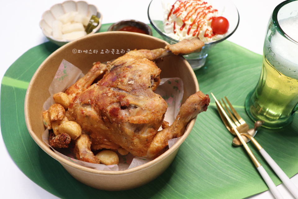 Menambahkan siung bawang putih utuh ke dalam penggorengan akan menambah aroma dan rasa yang luar biasa. Lumuri ringan siung bawang putih yang belum dikupas dengan campuran tepung yang sama seperti untuk ayam. Meskipun bawang putih dengan banyak siung (‘yukjjok’ garlic) bagus, siung bawang putih utuh biasa juga berfungsi dengan baik.
