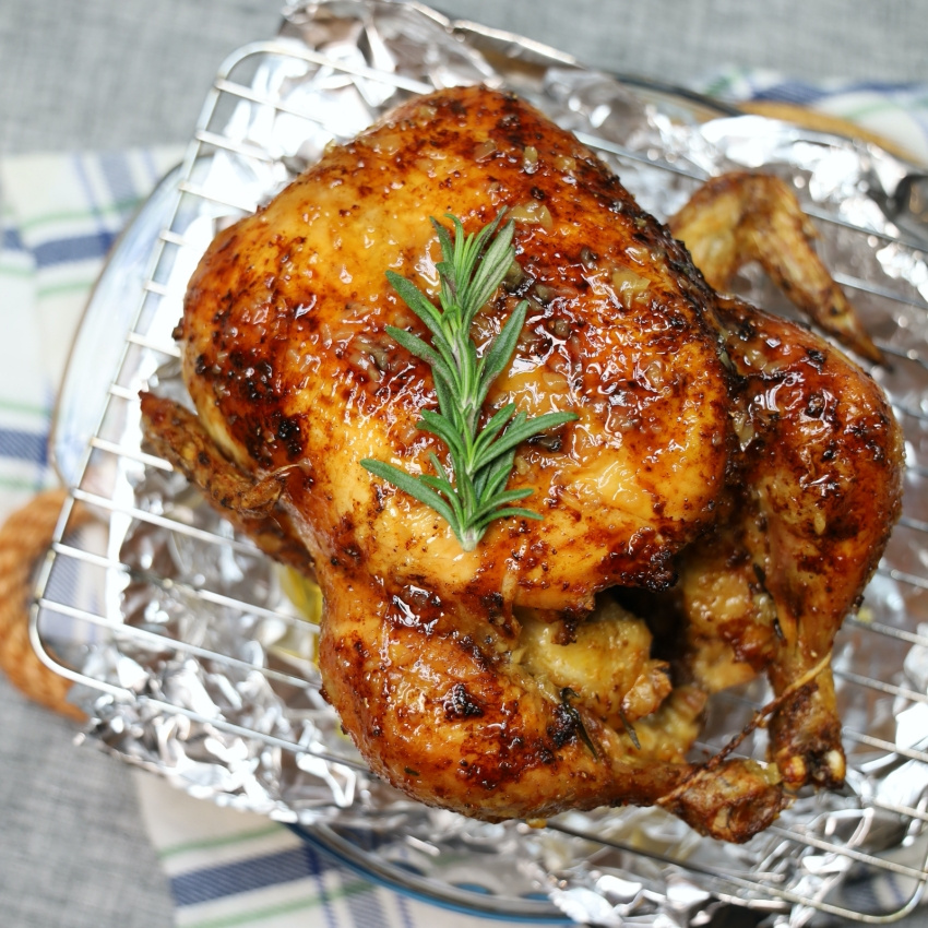 8. Ingat, sangat penting untuk memasak ayam hingga matang sempurna untuk mencegah penyakit bawaan makanan! Terutama untuk ayam utuh seperti ini, menggunakan termometer daging adalah cara terbaik untuk memastikan ayam matang dengan aman. Tusukkan termometer ke bagian paha yang paling tebal (hindari tulang); suhu internal harus mencapai setidaknya 75°C (165°F).
