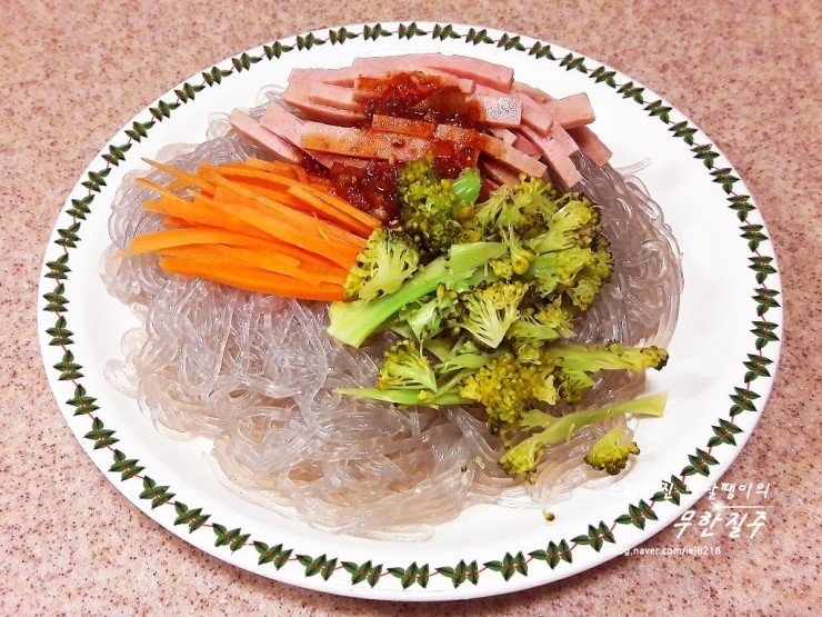 Setelah direbus, bilas Spam dan sayuran di bawah air dingin untuk mendinginkannya. Menjaga bahan-bahan tetap segar dan berwarna-warni akan meningkatkan tampilan dan rasa Bibim Dangmyeon Anda.