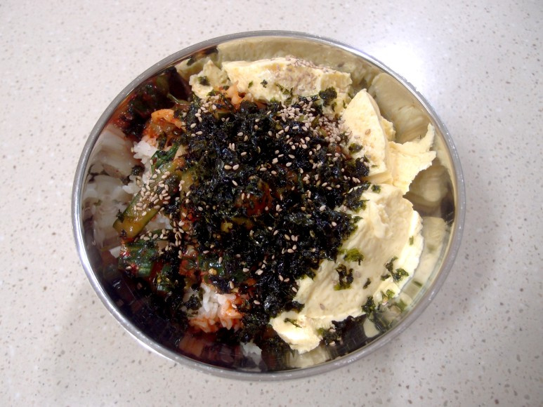 Taburi nasi dan campuran kimchi dengan porsi telur kukus yang melimpah. Telur kukus yang lembut melengkapi kerenyahan kimchi timun dengan indah.