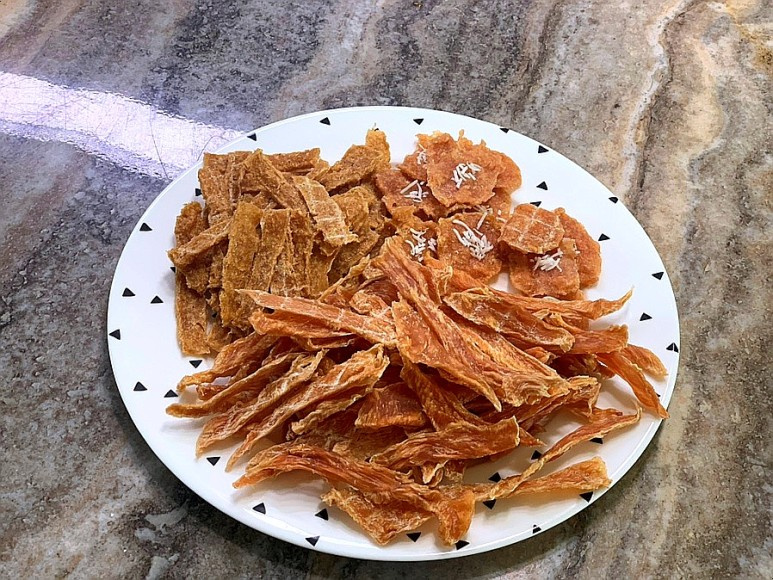 [2. Stik Dada Ayam] Keluarkan 3-4 potong dada ayam yang telah disisihkan sebelumnya. Potongan ini tidak akan digiling. Potong sesuai bentuk dan ukuran yang diinginkan dengan pisau. Iris tipis, masukkan ke dalam dehydrator, dan keringkan hingga matang pada suhu 70°C (158°F) selama kurang lebih 12 jam. Camilan ini akan memiliki tekstur yang lebih kenyal.