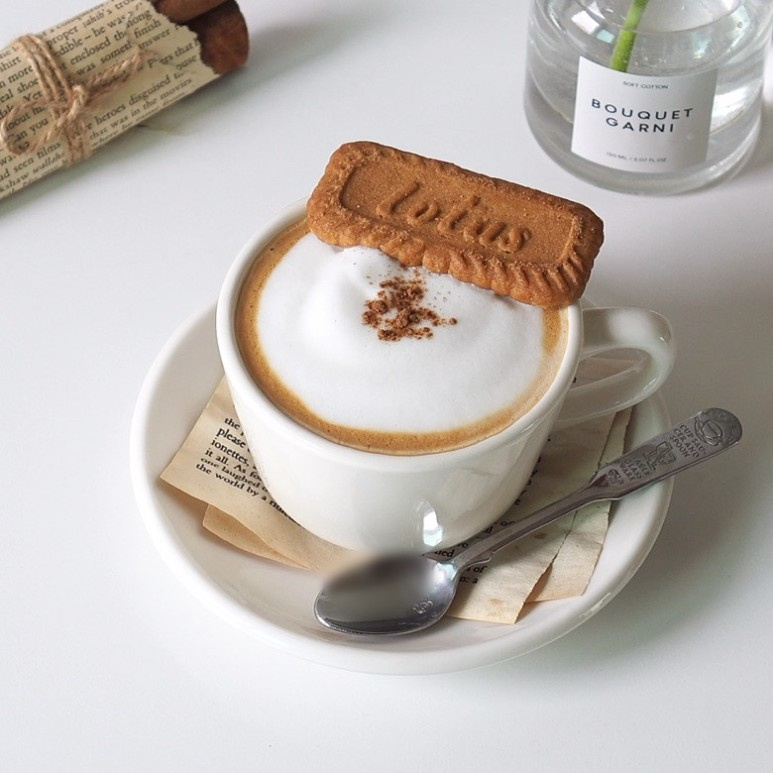 Untuk sentuhan akhir tekstur dan rasa manis, letakkan biskuit Lotus di atas cappuccino. Biskuit ini murni untuk hiasan dan dapat dihilangkan jika Anda mau.