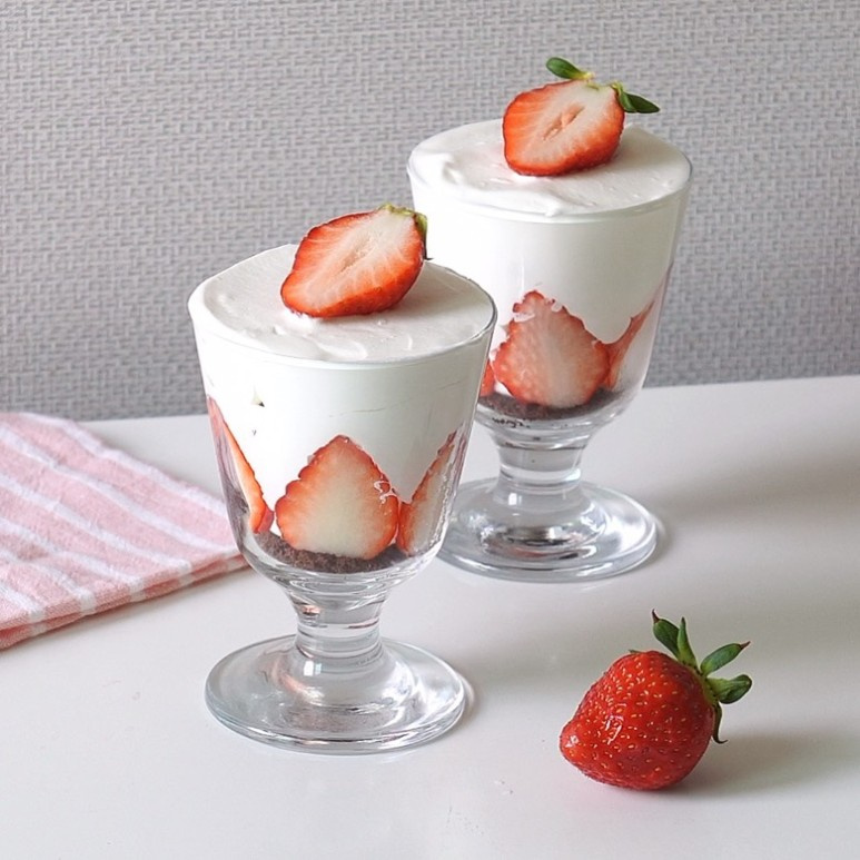 Siapkan stroberi segar Anda untuk hiasan. Iris tipis bagian tengah stroberi dan tekan perlahan ke tepi bagian dalam cangkir. Ini menambahkan elemen visual yang indah dan akan terlihat saat Anda mengisi cangkir.