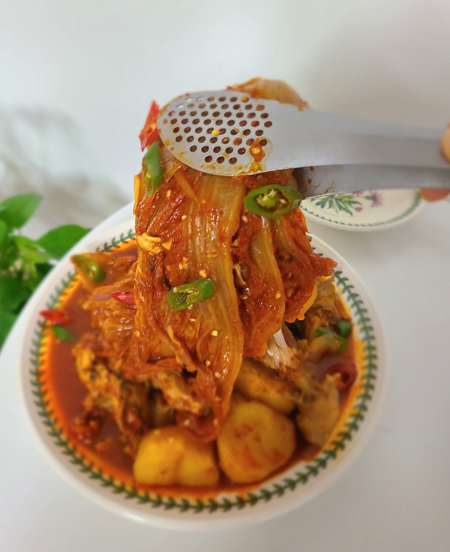 Dakbokkeumtang (sup ayam pedas rebus) ini memanfaatkan rasa mendalam dari kimchi tua, yang saya buat akhir pekan lalu menggunakan kimchi buatan sendiri dari rumah orang tua saya. Kelezatan kimchi membuat hidangan ayam ini semakin nikmat. Saat nafsu makan berkurang, hidangan ini saja sudah cukup; tidak perlu lauk lain. Mari kita masak porsi besar dengan satu ekor ayam dan satu bonggol kimchi.