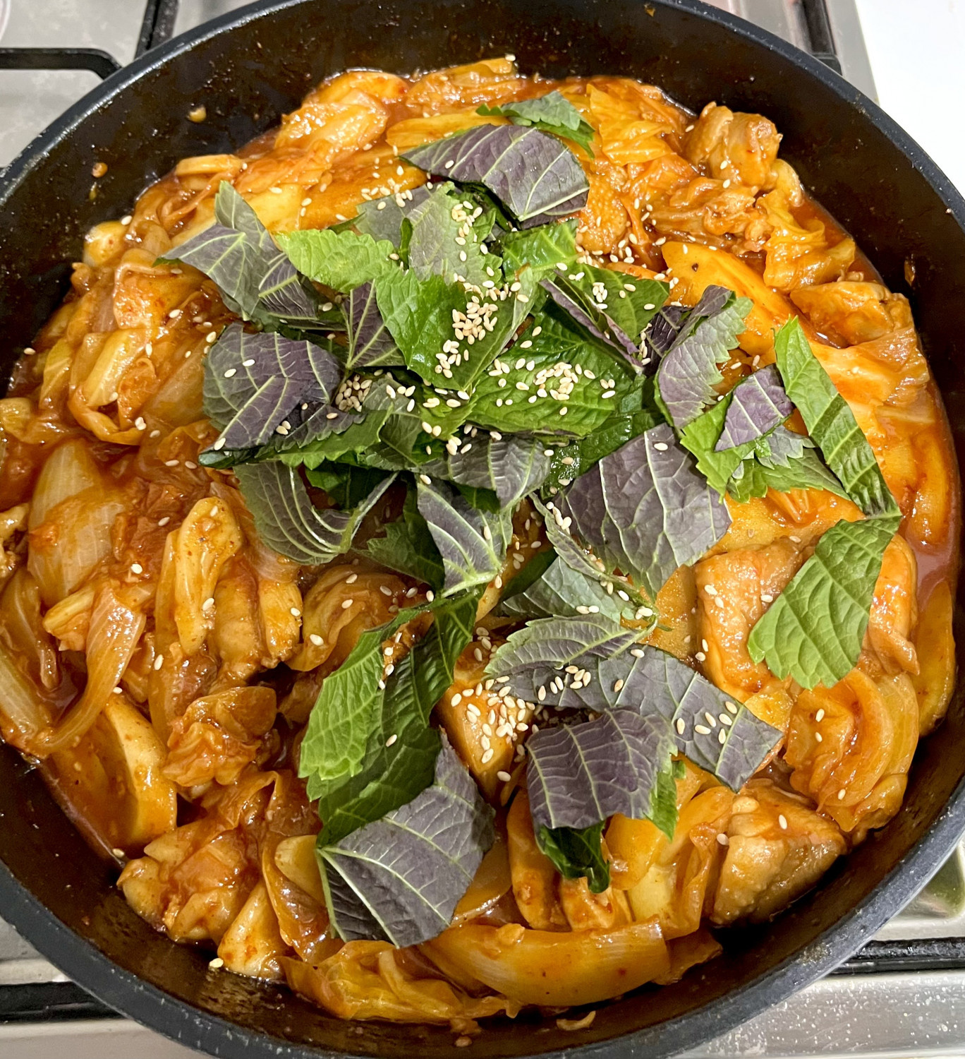 Setelah saus mengental dan melapisi semua bahan dengan indah, taburkan irisan daun perilla tebal di atasnya. Hiasi dengan taburan biji wijen. Tutup wajan lagi dan masak dengan api kecil selama 3-5 menit lagi hingga daun perilla sedikit layu dan harum. Langkah terakhir ini memberikan aroma segar yang luar biasa pada Dakgalbi. Nikmati Dakgalbi buatan sendiri Anda yang lezat – sangat nikmat juga disajikan di atas nasi!