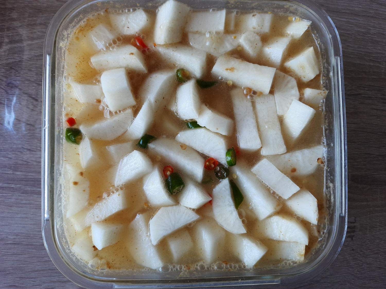 Saatnya membuat kuah kimchi! Tuangkan sekitar 500ml air soda dingin (atau air berkarbonasi) ke atas lobak, pastikan lobak terendam seluruhnya. Aduk perlahan untuk melarutkan bubuk bumbu apa pun. Pindahkan campuran ke wadah kedap udara dan simpan di lemari es selama 2-3 hari untuk fermentasi. Kuahnya akan menjadi lebih jernih dan rasanya akan semakin kaya. Jika setelah beberapa hari air berkurang dan lobak terpapar udara, tambahkan sedikit lagi air soda agar lobak tetap terendam sepenuhnya. Sajikan dingin untuk rasa terbaik!