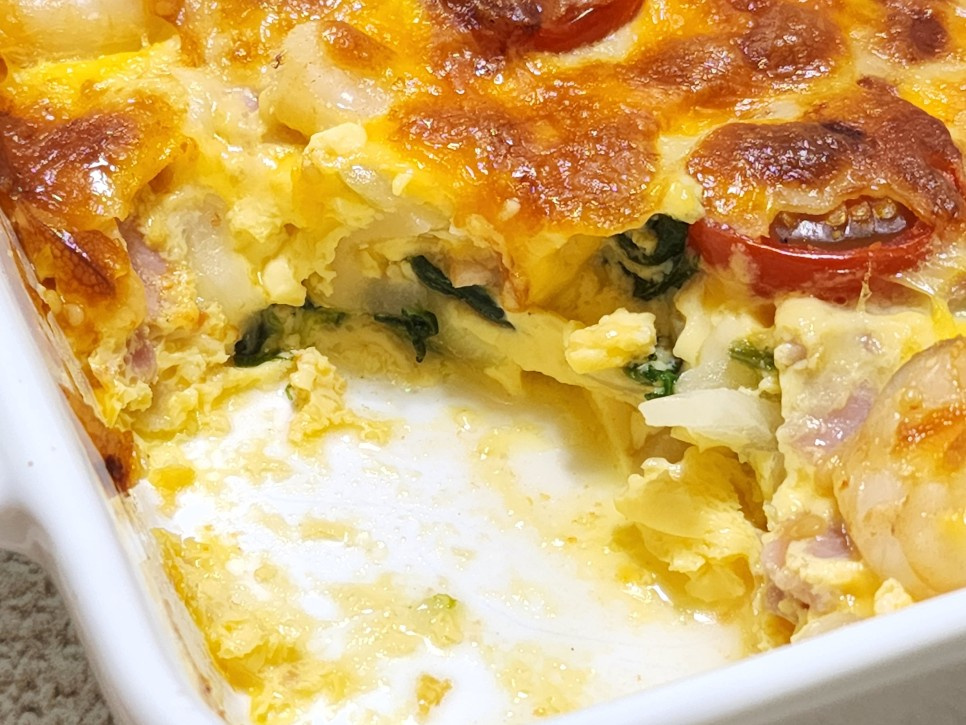 Tuangkan campuran telur yang sudah disaring secara perlahan dan merata di atas bahan-bahan dalam loyang. Tata tomat ceri belah di atasnya untuk memberikan semburat warna dan kesegaran. Ini akan menambah daya tarik visual yang indah.