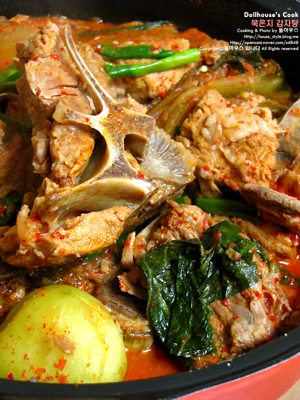 Pindahkan tulang punggung babi dan kaldu yang sudah matang dari panci presto ke panci lebar. Tambahkan daun perilla, daun bawang, kentang kukus, dan cabai Cheongyang yang sudah disiapkan. Didihkan kembali dan masak sebentar. Terakhir, tambahkan bubuk perilla secukupnya untuk rasa yang lebih kaya dan gurih. Sajikan selagi panas dengan nasi putih dan nikmati Gamjatang yang nyaman dan lezat ini!