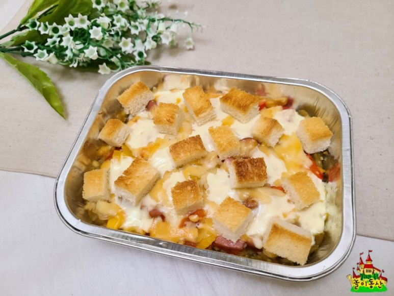 Panaskan oven Anda hingga 190°C. Masukkan loyang gratin yang sudah disiapkan ke dalam oven yang sudah dipanaskan, lalu panggang selama kurang lebih 10 menit, atau hingga keju meleleh dan berwarna keemasan, serta kubus roti terpanggang renyah. Sesuaikan waktu memanggang berdasarkan kinerja oven Anda.