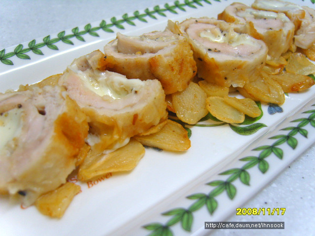 Gulung dada ayam menutupi keju dengan rapat, mirip seperti membuat sushi roll. Gulung dengan kencang. Kunci ujung gulungan dada ayam dengan tusuk gigi agar tidak terurai saat digoreng. Lapisi seluruh gulungan dengan tepung terigu sekali lagi secara tipis untuk memastikan lapisan merata.