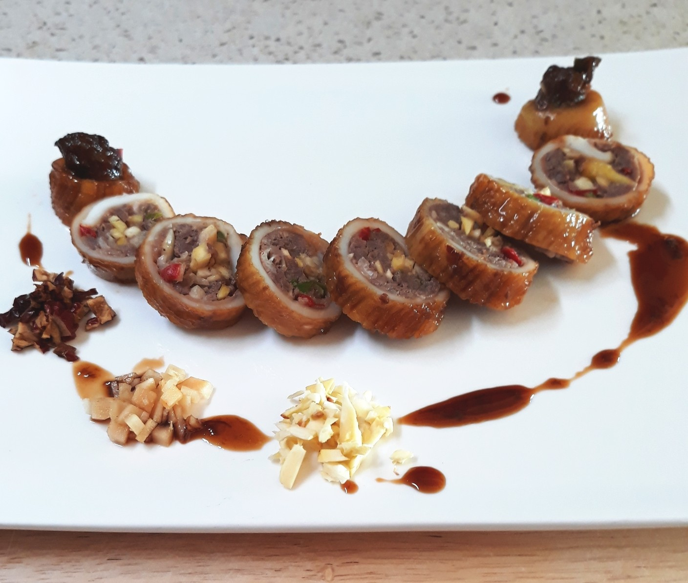 Gulungan Daging Sapi dan Cumi Saus Madu dengan Kacang Kastanye