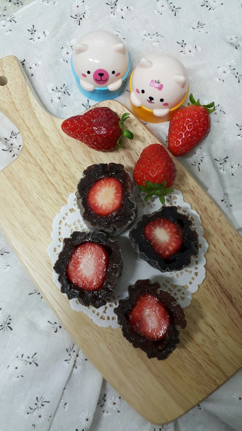Siapkan 5 buah stroberi segar. Cuci bersih stroberi, buang tangkainya, dan keringkan sepenuhnya. Kesegaran stroberi akan berpadu indah dengan rasa manis kesemek yang dalam.