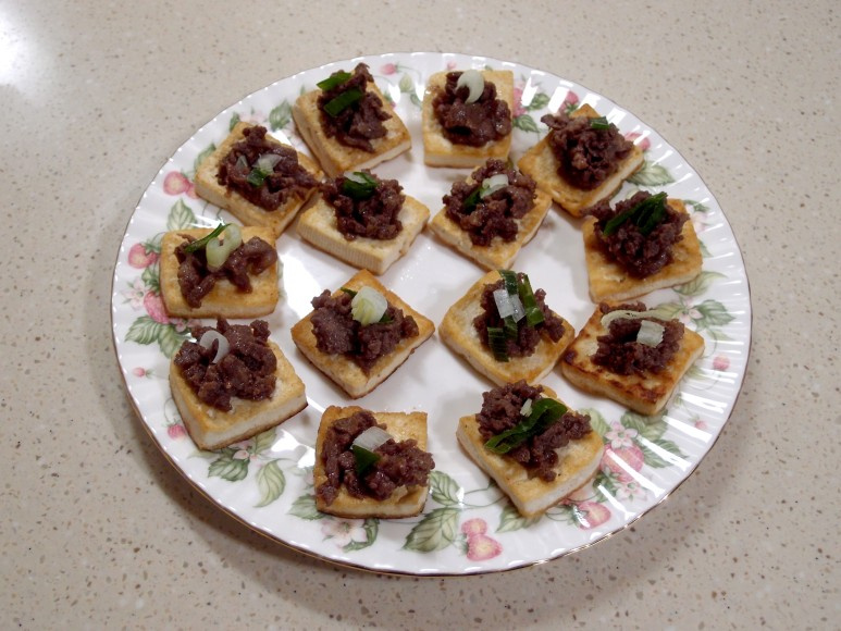 Dengan hati-hati, sendokkan bulgogi matang cincang halus ke bagian tengah irisan tahu yang tersusun, pastikan tahu masih terlihat.