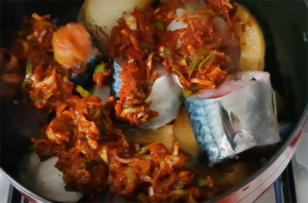 Setelah lobak melunak dan sedikit menyusut, letakkan potongan ikan kembung yang sudah dibersihkan dengan hati-hati di atas lobak dalam panci. Menyusun ikan di atas lobak membantu ikan menyerap bumbu dengan lebih efektif.