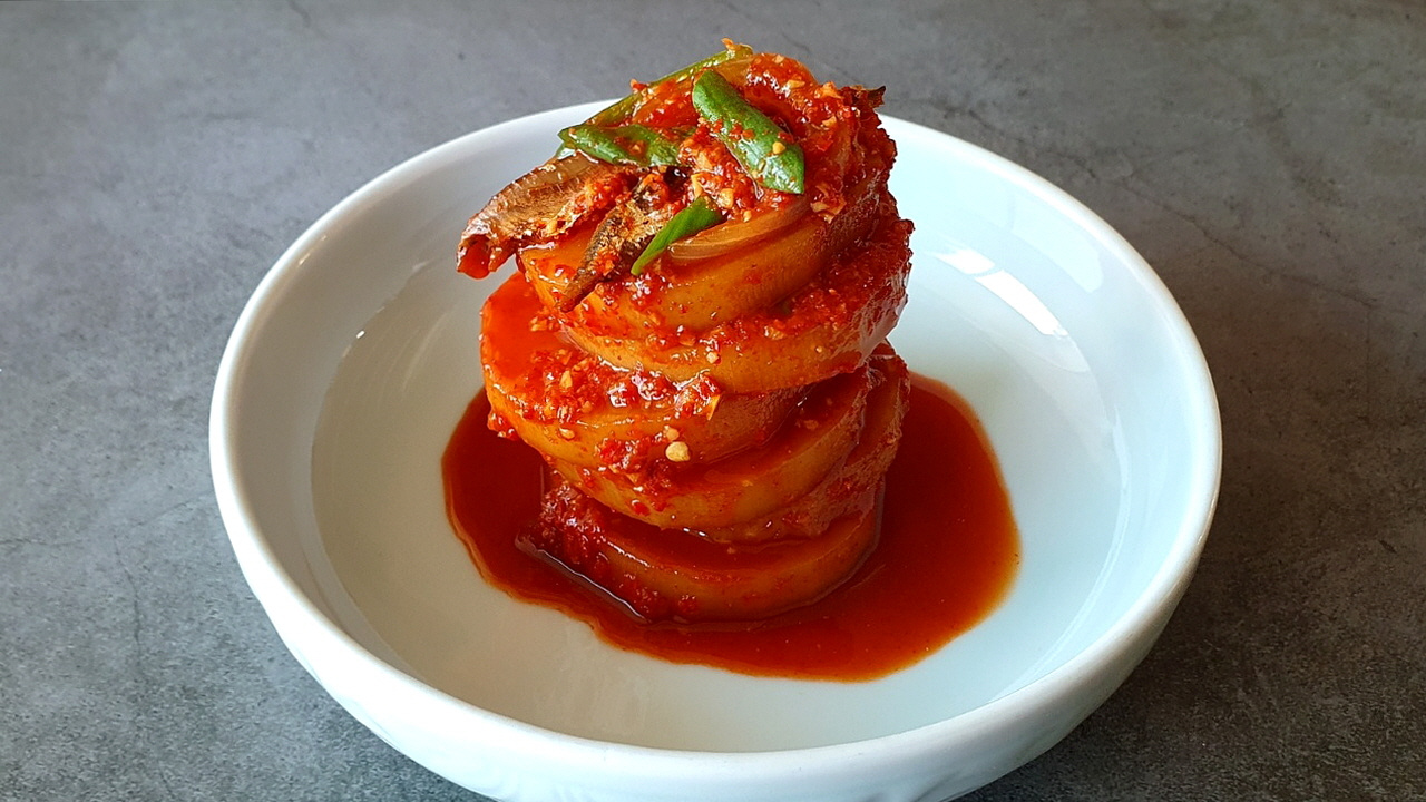 Pertama, kupas lobak Korea dan potong menjadi potongan tebal sekitar 1.5-2 cm yang mudah disantap (bentuk persegi atau setengah lingkaran). Memotong seperti ini akan mencegah lobak hancur saat dimasak dan menjaga teksturnya tetap baik.