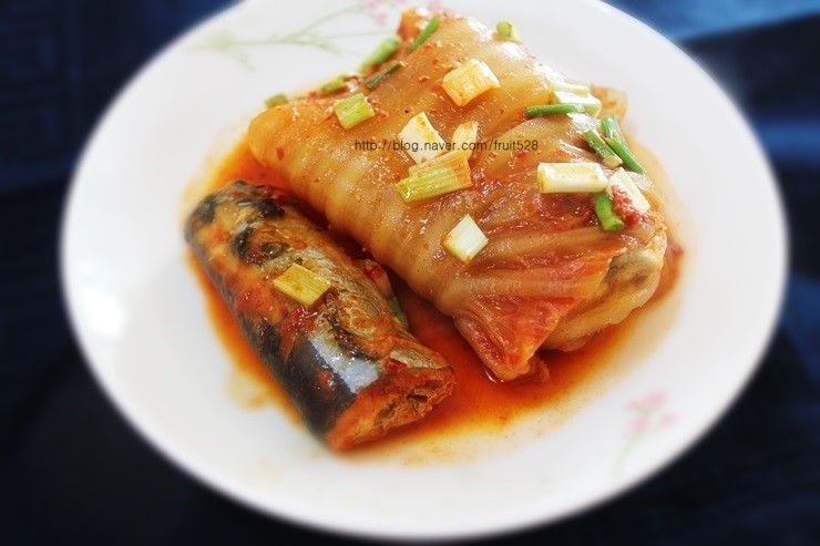 Kimchi tua yang sudah matang dipotong sedikit bagian atasnya, lalu buka lipatan daunnya dengan hati-hati. Letakkan satu potongan ikan tongkol yang sudah disiapkan di atas kimchi yang terbuka.