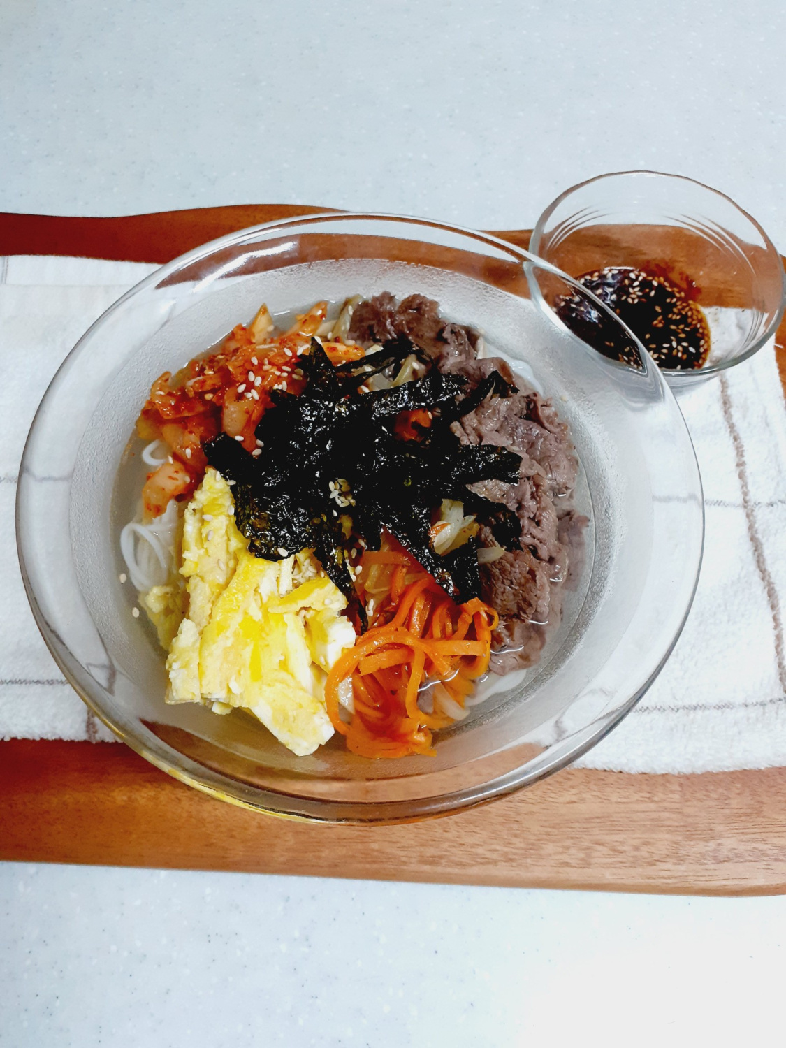 Untuk sentuhan akhir, potong lembaran rumput laut berbumbu menjadi strip panjang dan letakkan di atas topping. Tambahkan saus bumbu yang sudah disiapkan sesuai selera Anda. Sekarang, seruput dan nikmati Janchi-guksu Daging Sapi Anda yang lezat dan berlimpah!