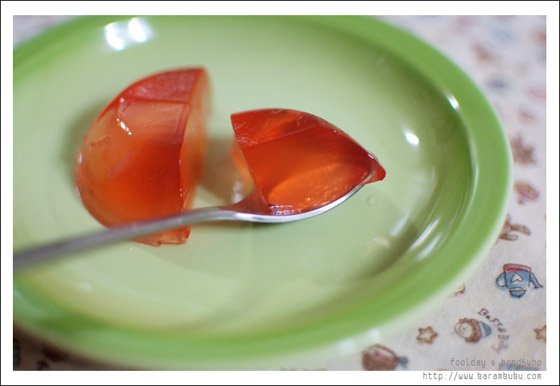 Tuang campuran jus ceri ke dalam panci. Masukkan secara bertahap 5 sendok makan bubuk agar-agar sambil terus diaduk untuk mencegah gumpalan. Masak dengan api sedang-kecil sambil terus diaduk perlahan. Setelah mulai mendidih, segera matikan api dan biarkan sedikit mendingin sebelum mengeras. Hati-hati jangan sampai mendidih terlalu lama, karena dapat melemahkan kekuatan pengerasan agar-agar.
