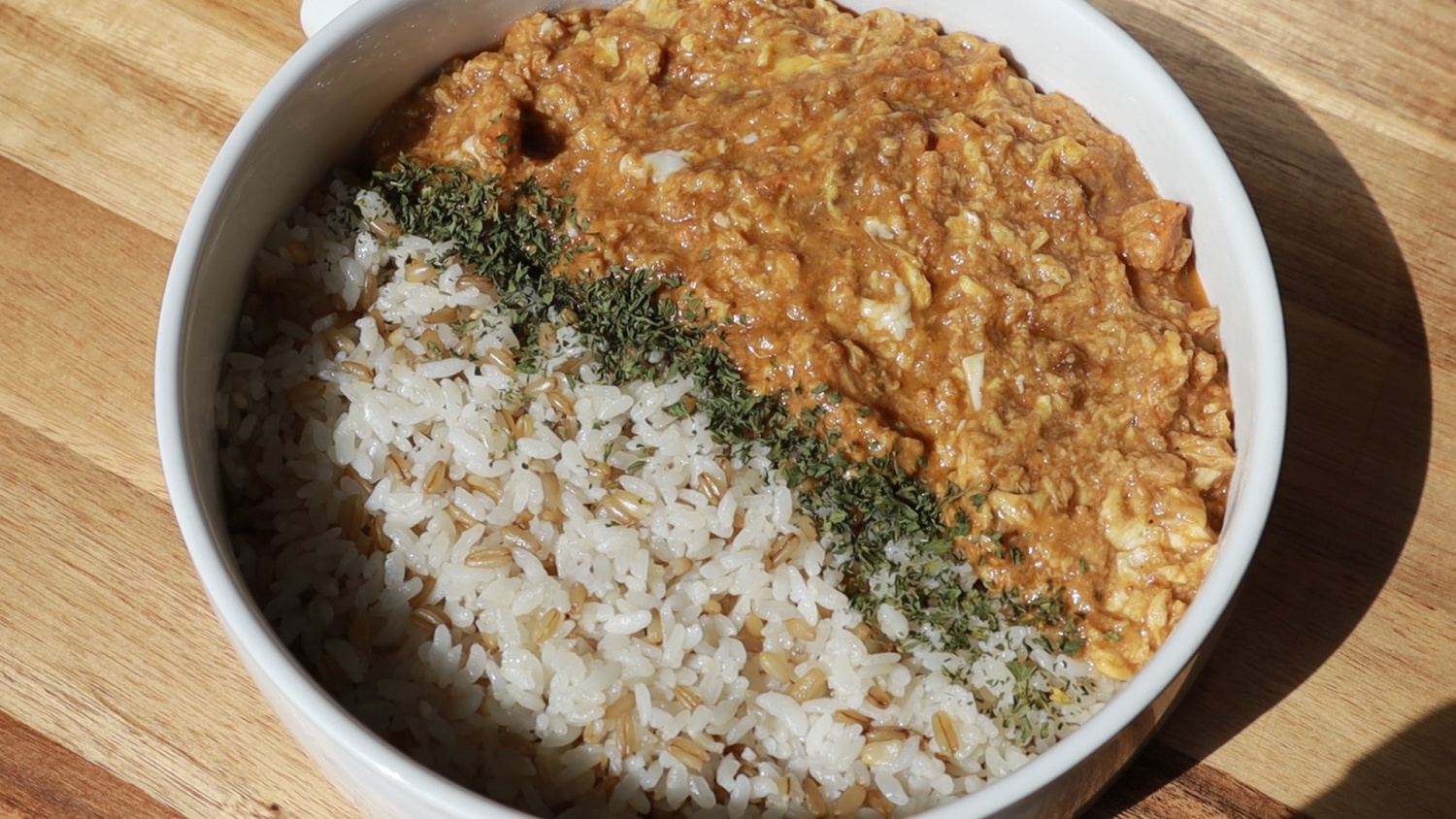 Dalam mangkuk saji, letakkan 1 porsi nasi di bagian bawah. Tuangkan campuran kari dan ayam yang sedang mendidih di atas nasi. Tuangkan perlahan campuran telur dan susu kedelai yang sudah dikocok di sekitar tepi kari. Jaga api tetap kecil dan aduk perlahan dengan spatula. Campuran telur akan mulai matang, menciptakan tekstur lembut dan empuk yang mirip dengan telur orak-arik.