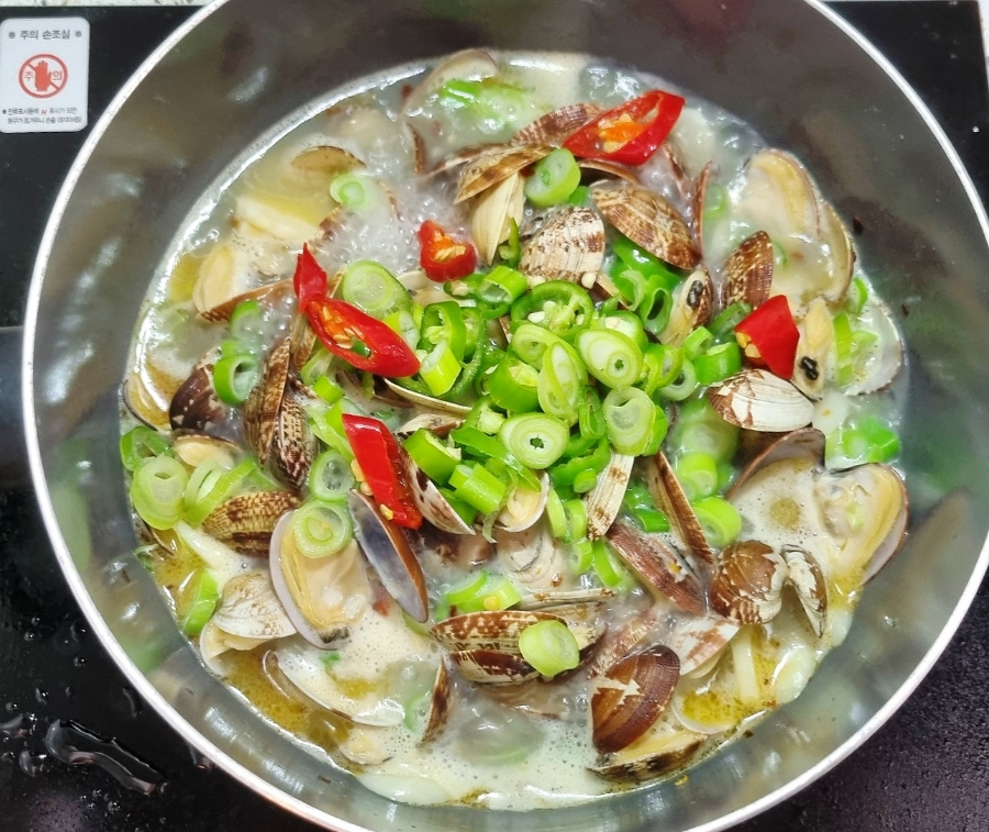Terakhir, tambahkan irisan cabai dan daun bawang, serta serpihan cabai merah jika menggunakan. Didihkan hingga mendidih kuat. Karena kerang sudah matang saat terbuka, Anda hanya perlu merebusnya sebentar (sekitar 1-2 menit) sebelum mematikan api. Ini agar kerang tidak menjadi alot dan tetap lembut.