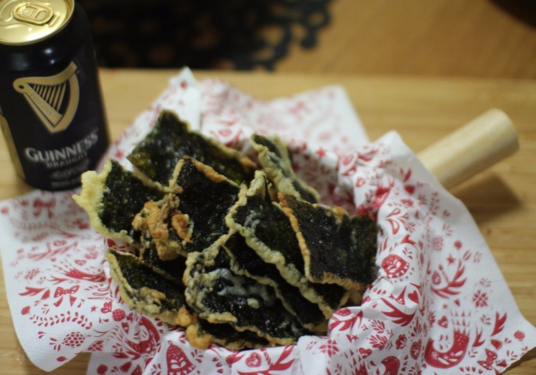 Setelah rumput laut berwarna cokelat keemasan dan renyah, angkat dari minyak dan letakkan di atas tisu dapur untuk menyerap kelebihan minyak. Jika Anda menyukai rasa pedas dari wasabi, pertimbangkan untuk mencampurkan 1 sendok makan pasta wasabi ke dalam adonan sebelum digoreng. Jumlah yang saya gunakan tidak sepenuhnya memberikan sensasi pedas di hidung, tetapi memang membantu mengurangi sedikit rasa berminyak. Kombinasi wasabi dan rumput laut goreng benar-benar cocok untuk bir! Ini juga akan fantastis disajikan bersama tteokbokki pedas!