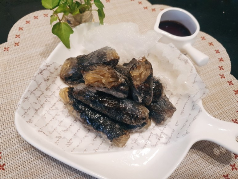 Siapkan wadah dangkal berisi air hangat. Celupkan selembar kertas nasi ke dalam air hangat selama sekitar 5-10 detik hingga menjadi lentur. Hati-hati jangan sampai terlalu lama merendamnya, karena bisa sobek. Letakkan selembar rumput laut di atas kertas nasi yang sudah lentur, lalu tambahkan sebagian bihun berbumbu di atas rumput laut tersebut.