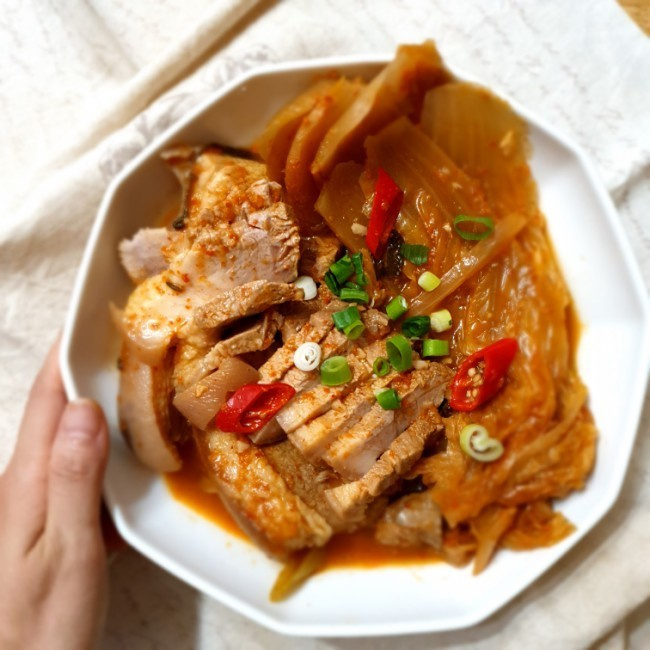Daging babi sangat penting untuk menambah kekayaan rasa Kimchi Jjim! Potong daging babi menjadi ukuran yang sedikit lebih besar dari sekali gigit dan susun di atas lapisan kimchi. Baik leher babi maupun perut babi berfungsi dengan baik.